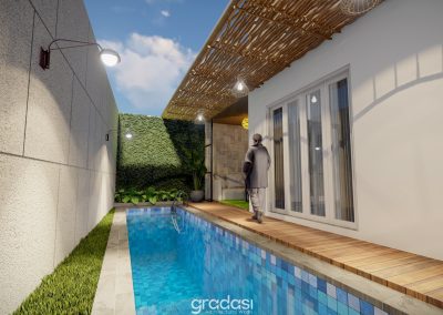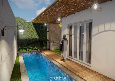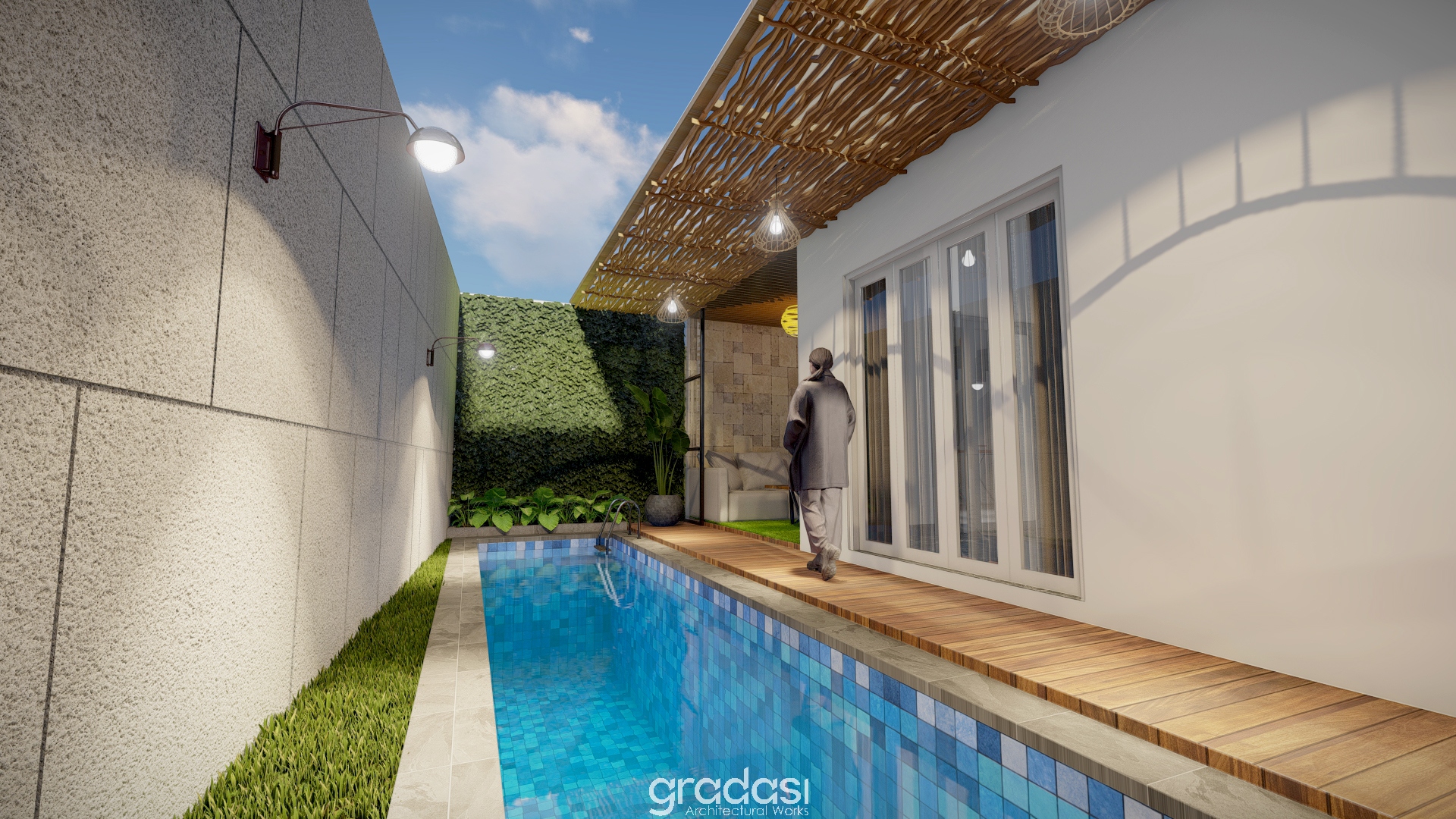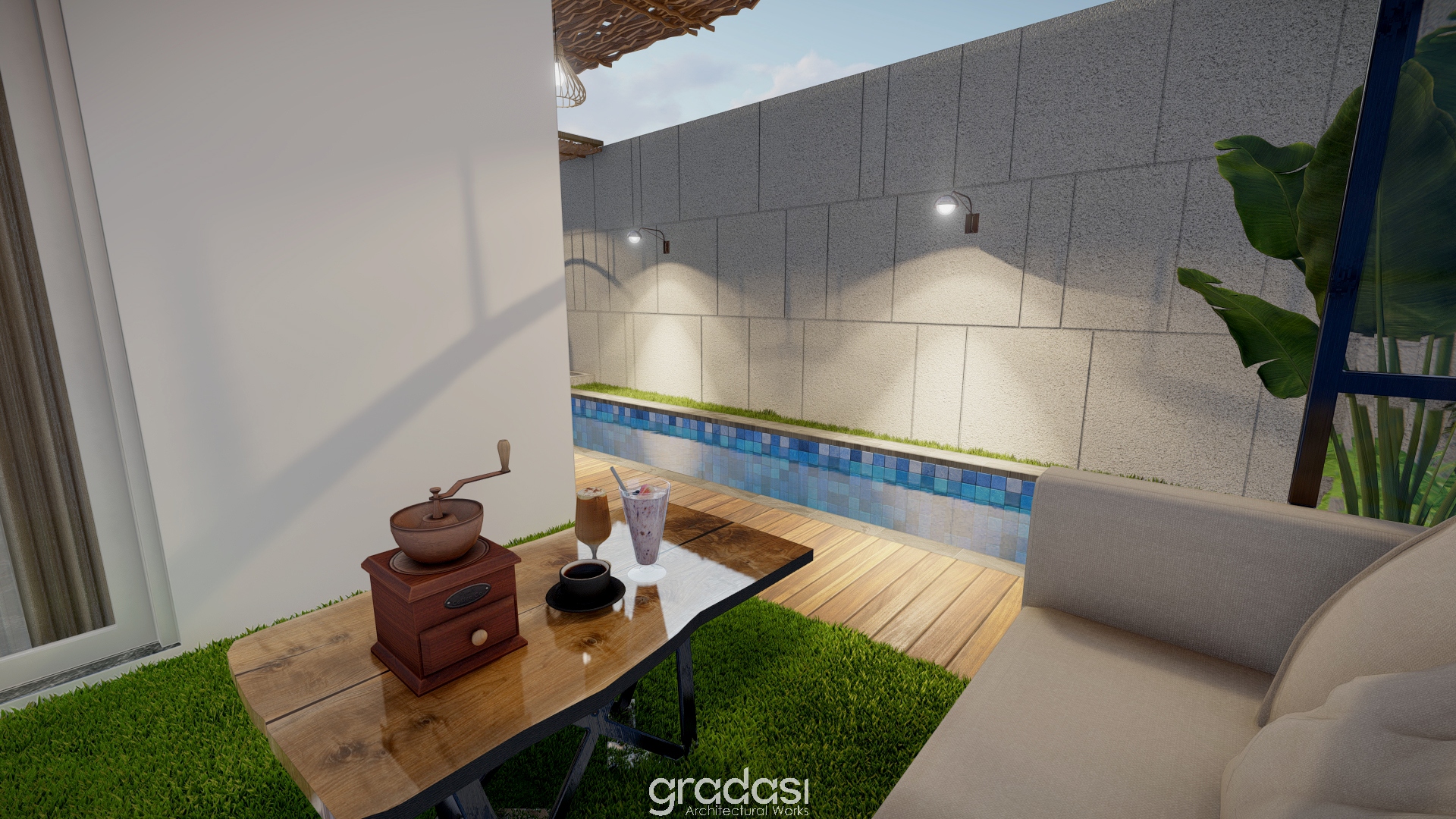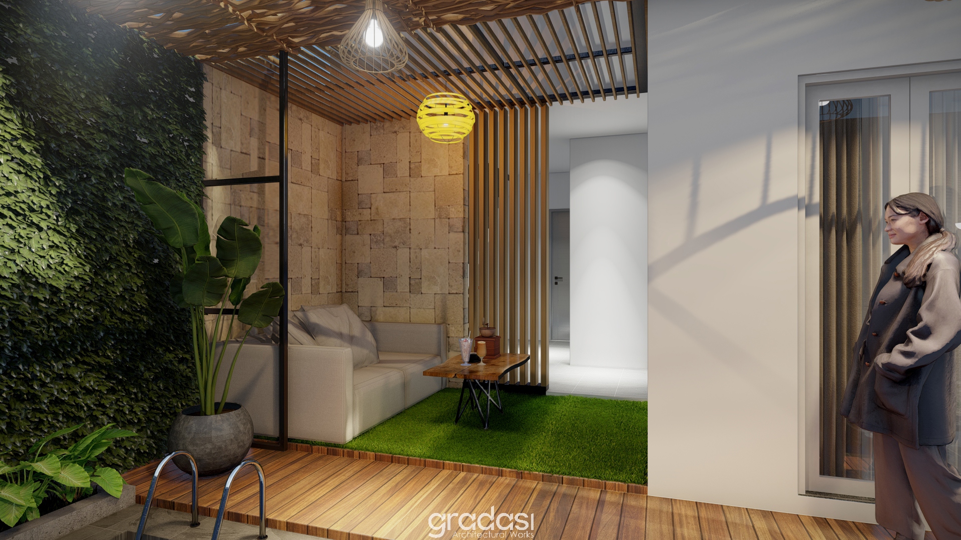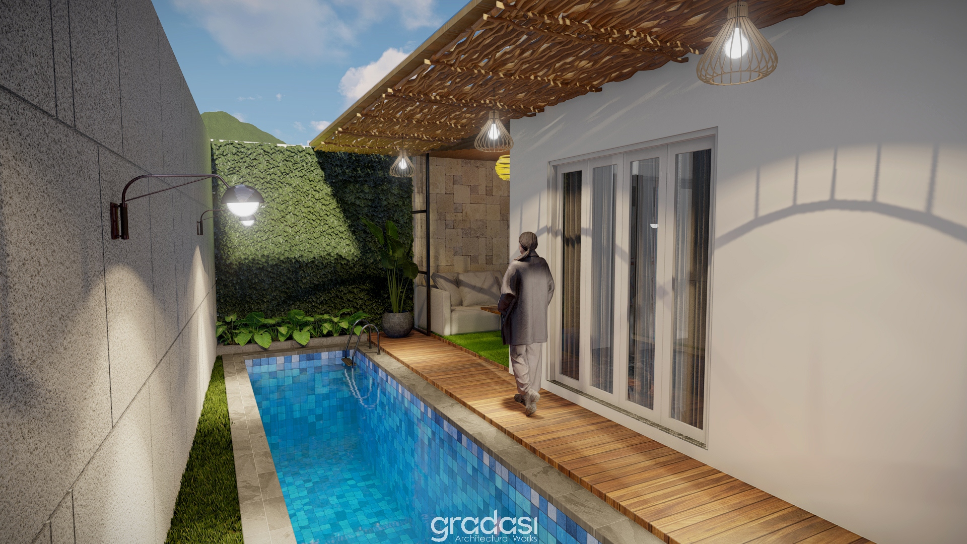 Desain eksterior halaman belakang rumah dengan style tropis yang berlokasi di Kota Batu, Jawa Timur.
