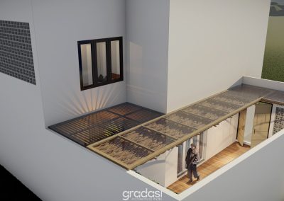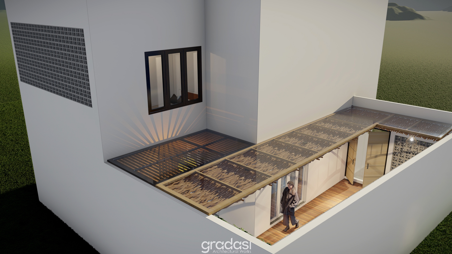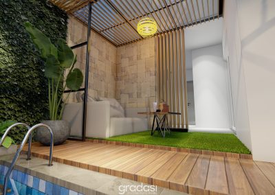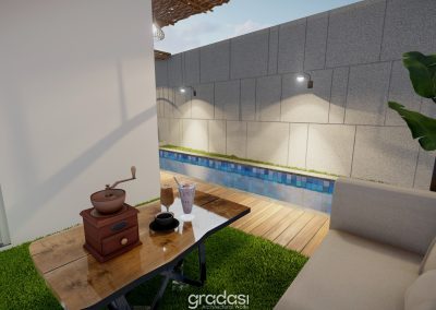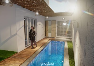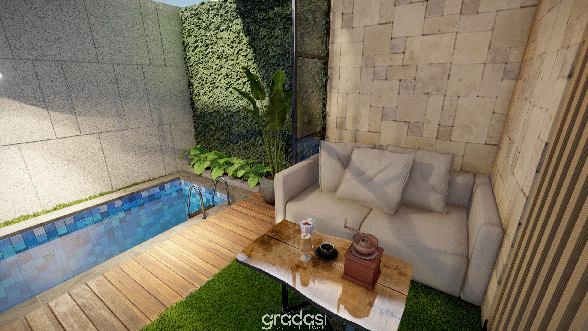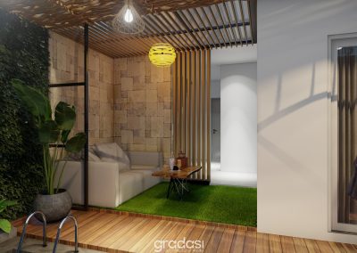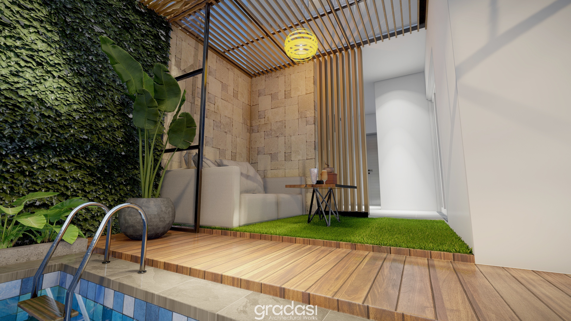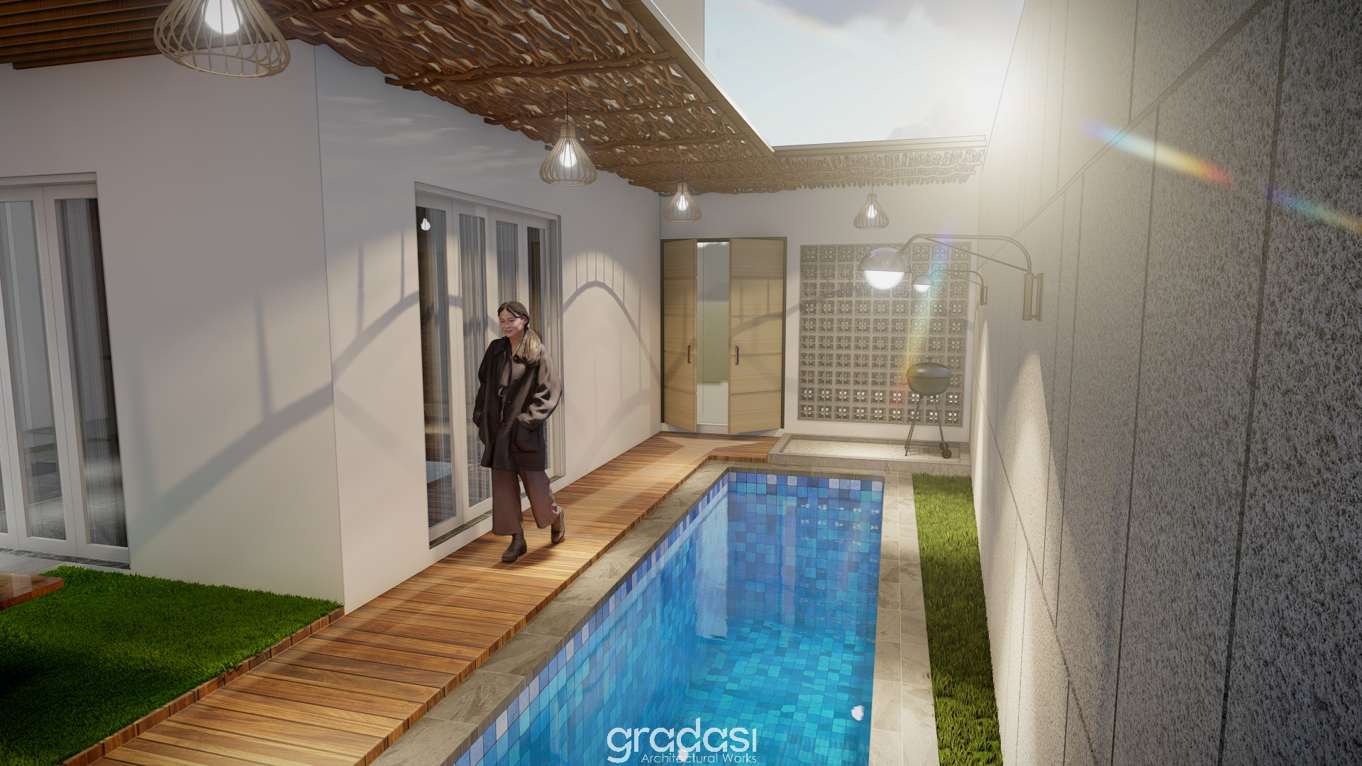 Desain eksterior halaman belakang rumah dengan style tropis yang berlokasi di Kota Batu, Jawa Timur.